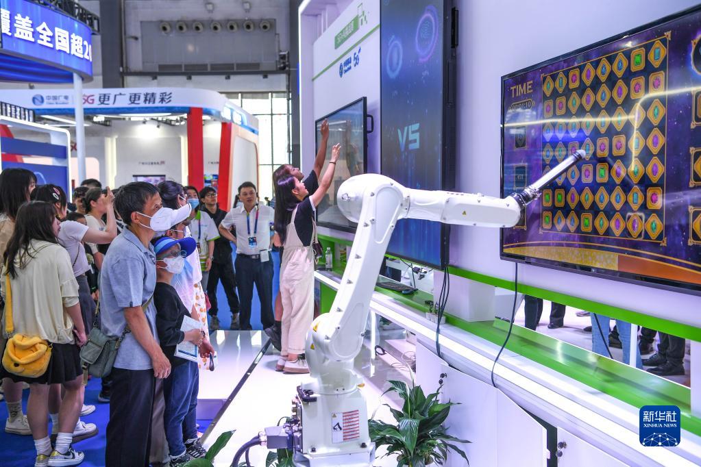 5月26日,參觀者在數博會展館體驗5G+AI人與機器人挑戰賽。