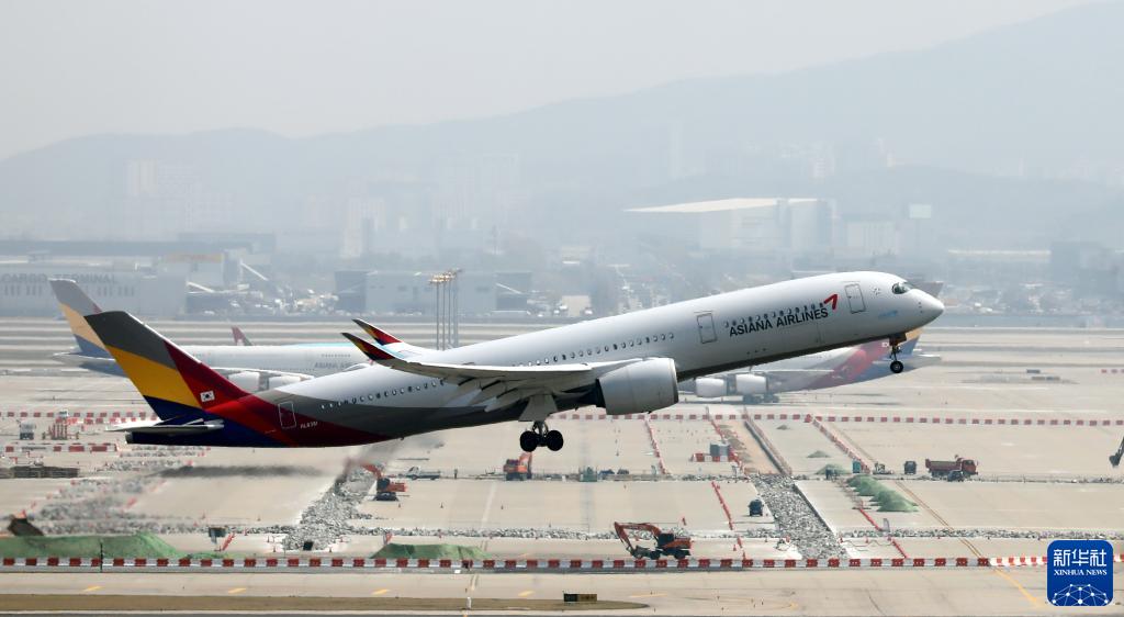這是2022年4月19日拍攝的韓亞航空一客機從韓國仁川國際機場起飛的資料照片。