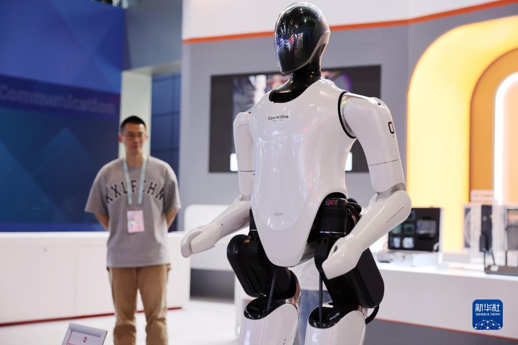 這是5月26日在中關村國家自主創新示范區展示中心拍攝的一款全尺寸人形仿生機器人。