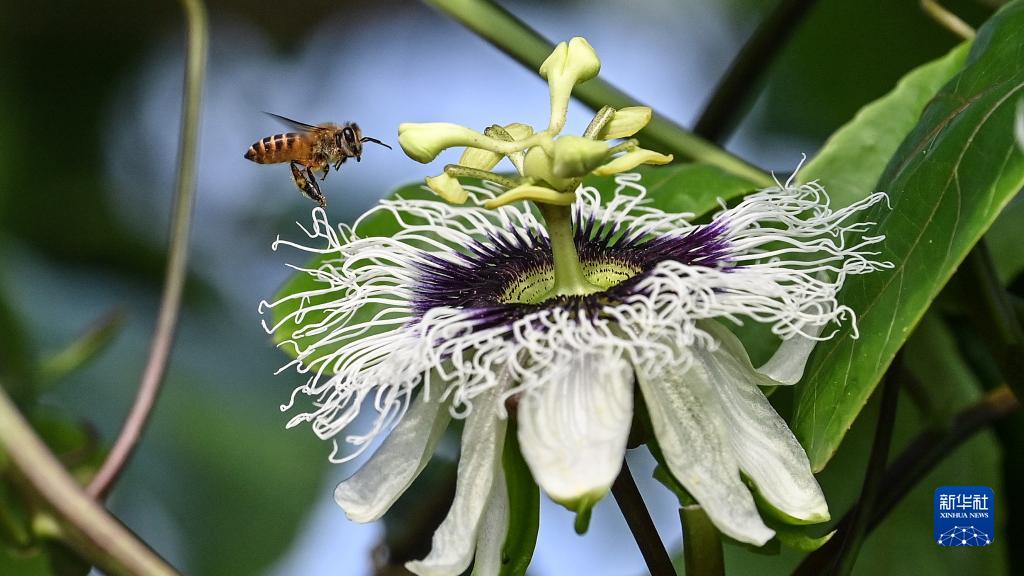 欽州市欽南區犀牛腳鎮烏雷村的黃金百香果園內百香果花盛開(5月25日攝)。