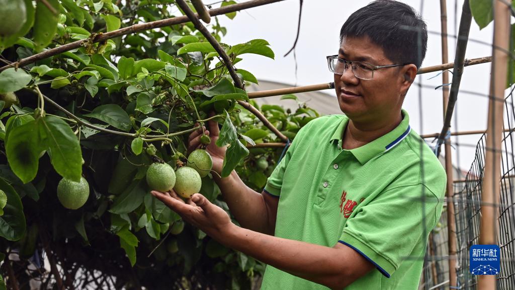 在欽州市欽南區犀牛腳鎮大坪村一戶庭院內,“木瓜哥”查看黃金百香果長勢(5月25日攝)。