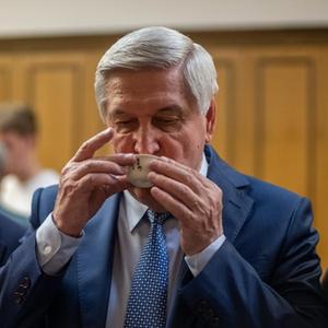 5月24日,在俄羅斯莫斯科的國家杜馬大樓,俄中友好協會主席、俄羅斯國家杜馬(議會下院)第一副主席伊萬·梅利尼科夫(中)品味來自中國云南的茶。新華社記者 孟菁 攝