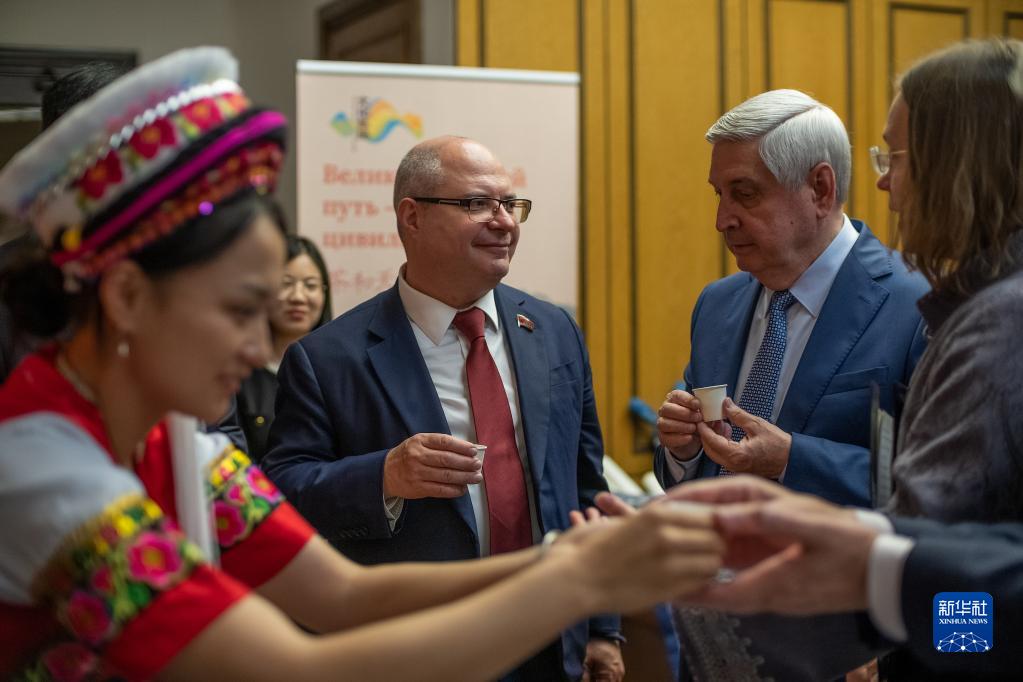 5月24日,在俄羅斯莫斯科的國家杜馬大樓,俄中友好協會主席、俄羅斯國家杜馬(議會下院)第一副主席伊萬·梅利尼科夫(右二)與俄國家杜馬資產、土地與財產關系問題委員會主席謝爾蓋·加夫里洛夫(右三)品味來自中國云南的茶。新華社記者 孟菁 攝