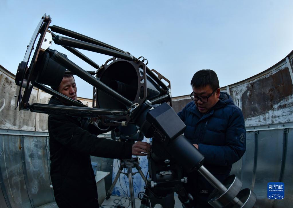 尤顯龍(左)和同事唐鵬在調試望遠鏡(5月23日攝)。