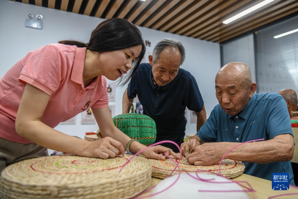 5月26日,老師在孝里街道社區黨群服務中心內指導遷居村民學習編織技藝。