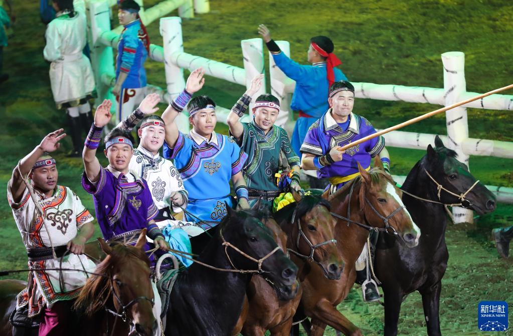當日,由內蒙古民族藝術劇院出品的2023年大型馬舞劇《千古馬頌》在呼和浩特上演。該劇以馬術表演為主,綜合運用了舞蹈、器樂、雜技等藝術元素,融合了現代高科技舞臺技術,以全新藝術形式生動演繹了人與馬相遇、相識、相伴、不離不棄、生死與共的情感歷程,體現了人、馬與自然和諧共存的精神。