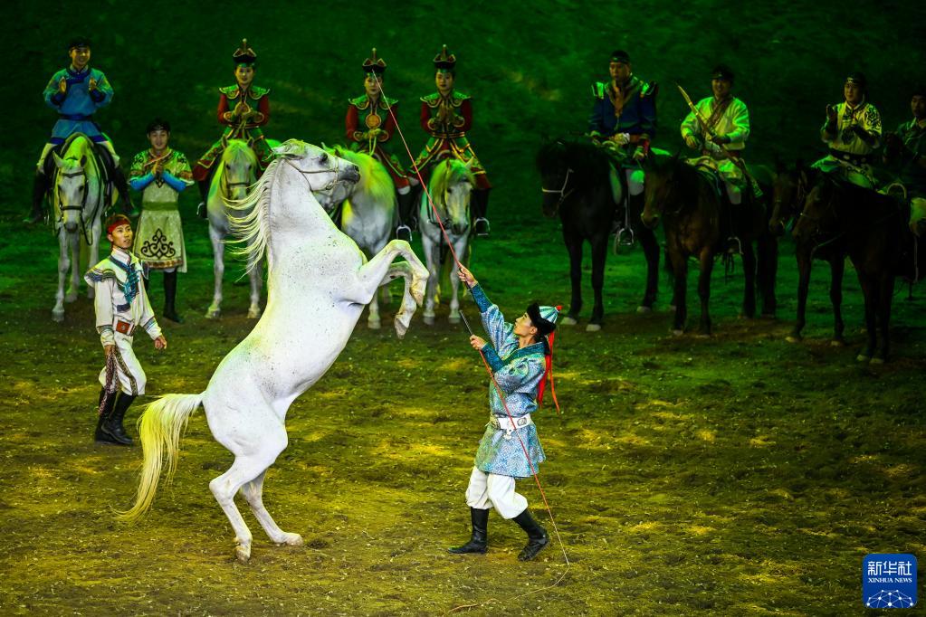 當日,由內蒙古民族藝術劇院出品的2023年大型馬舞劇《千古馬頌》在呼和浩特上演。該劇以馬術表演為主,綜合運用了舞蹈、器樂、雜技等藝術元素,融合了現代高科技舞臺技術,以全新藝術形式生動演繹了人與馬相遇、相識、相伴、不離不棄、生死與共的情感歷程,體現了人、馬與自然和諧共存的精神。