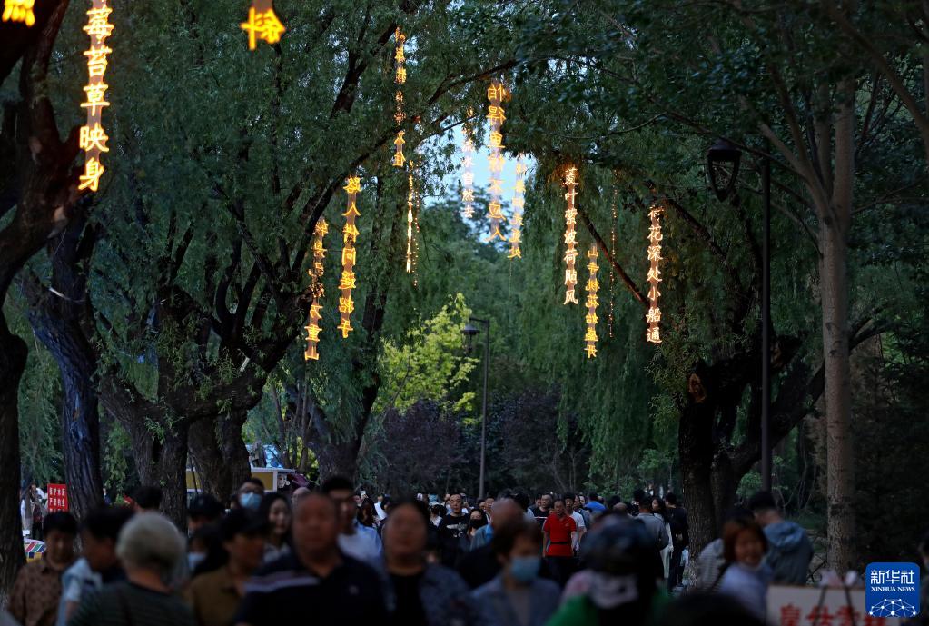 近日,沈陽市萬泉公園打造的一條詩詞漫道成為游客和市民的網紅打卡地。每當夜幕降臨,幾十首古詩詞彩燈在這條300余米道路的樹梢枝頭熠熠閃爍,以詩入景,一步一詩。