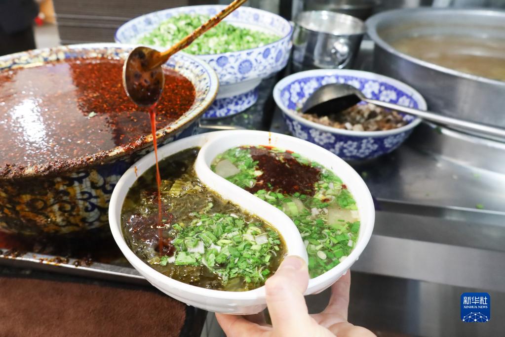 這是5月26日在蘭州市城關區舌尖尖牛肉面美食坊拍攝的“鴛鴦牛肉面”產品。