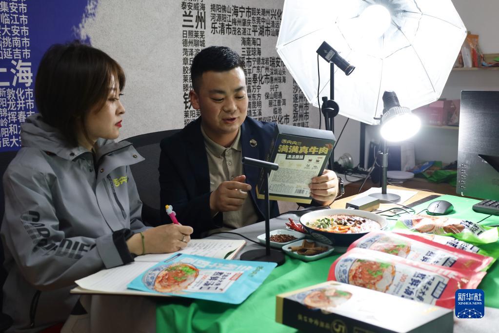 5月26日,在位于蘭州市的舌尖尖居家牛肉面倉儲中心,工作人員進行直播帶貨。