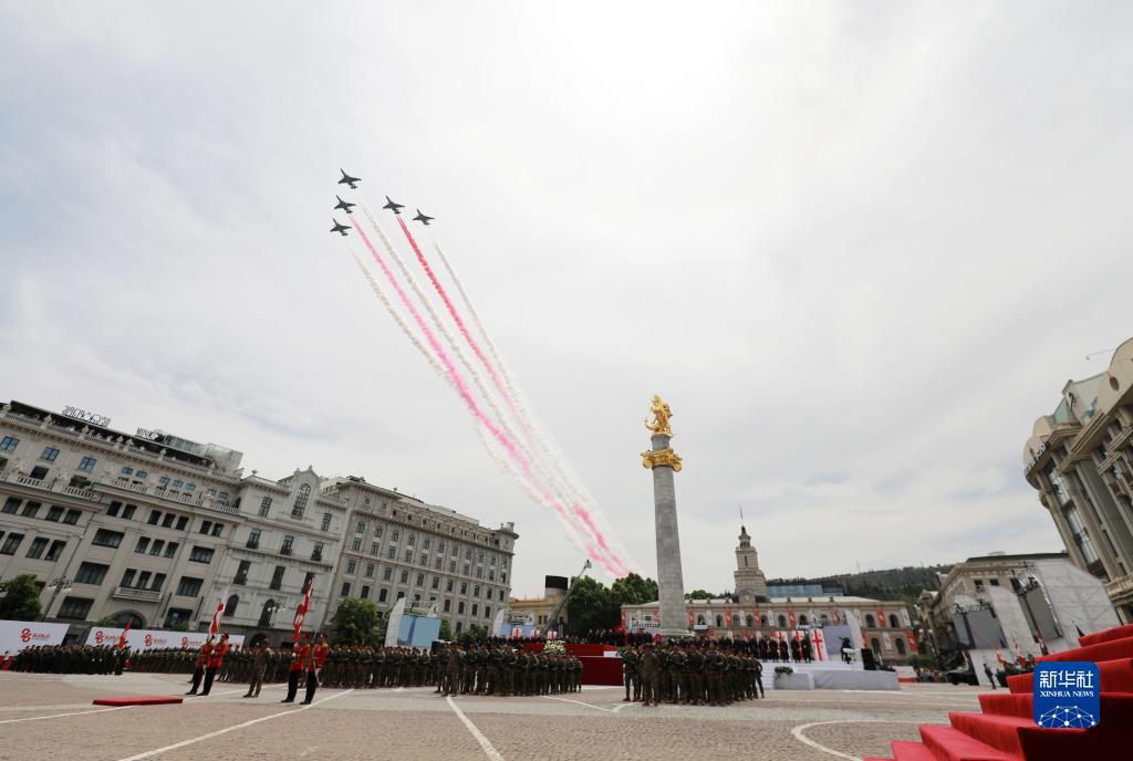 5月26日,在格魯吉亞首都第比利斯舉行的慶?;顒由?,飛機飛過自由廣場。