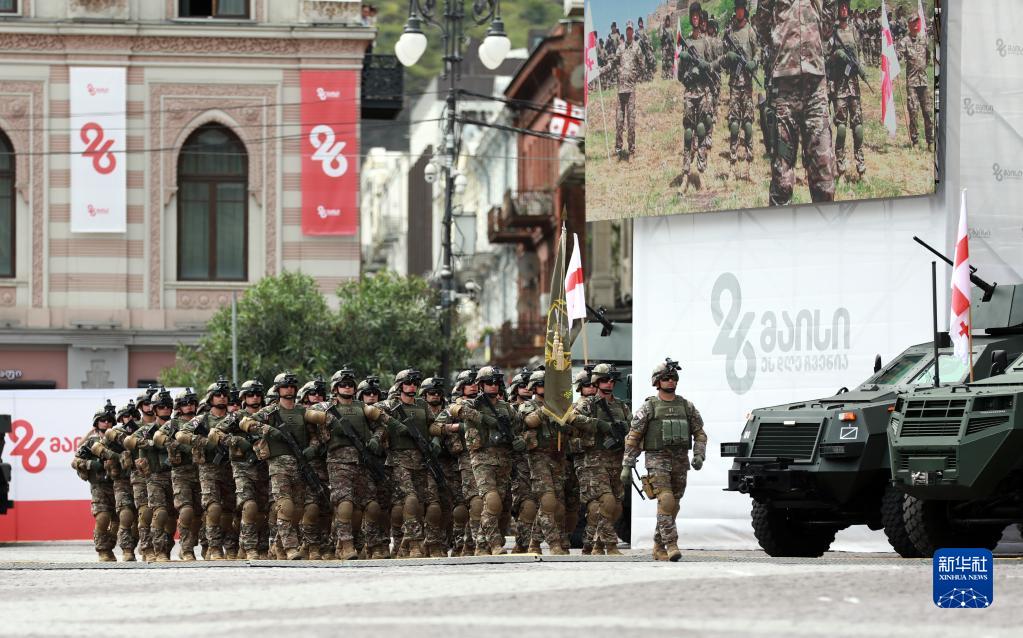 5月26日,在格魯吉亞首都第比利斯,格魯吉亞軍人在自由廣場接受檢閱。