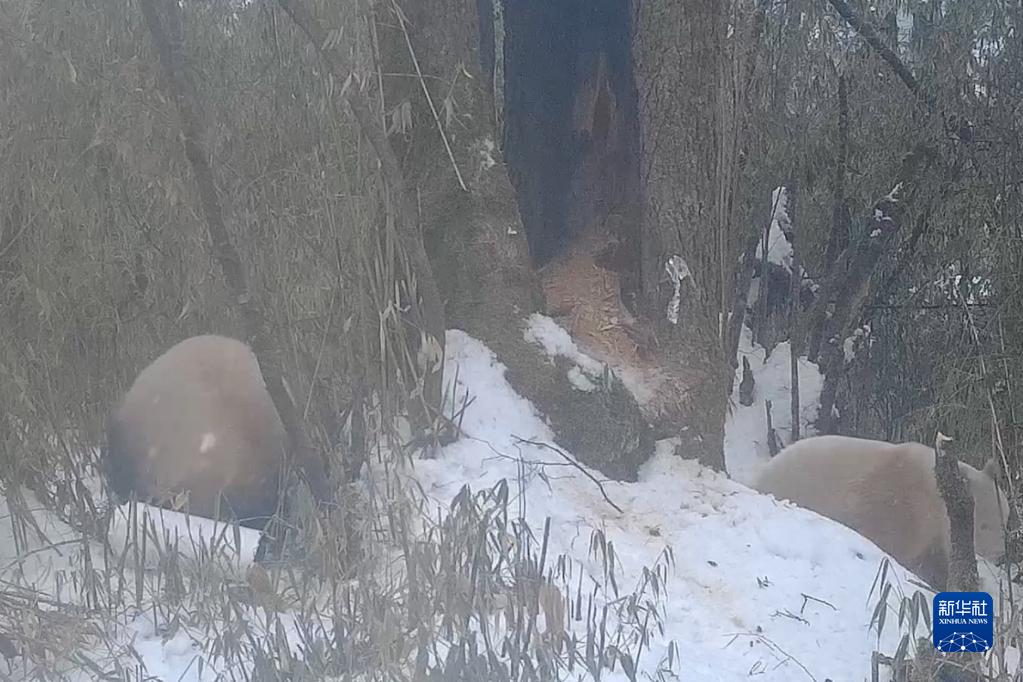 這是2月份,紅外相機拍攝到的大熊貓媽媽(左)追趕白色大熊貓(右)的畫面。