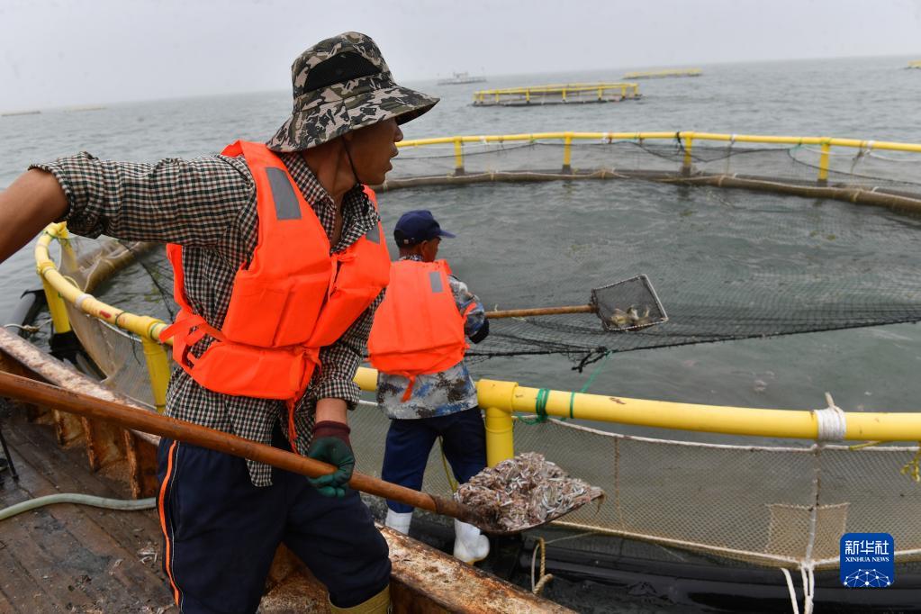 5月26日,在日照市盛隆水產養殖有限公司海洋牧場,漁民在給網箱內養殖魚投喂小魚。
