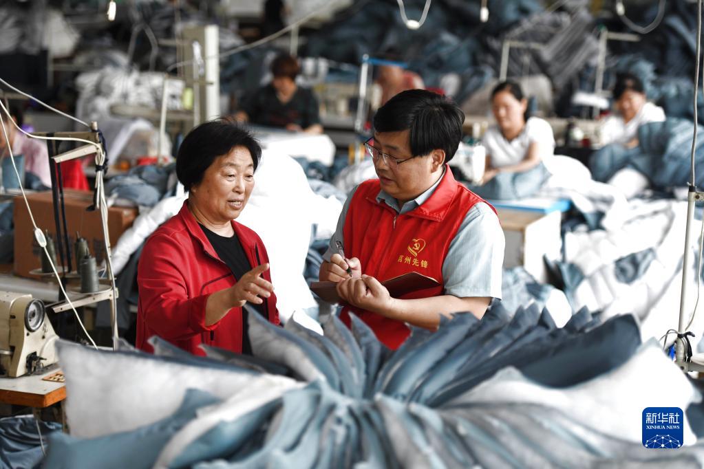 5月25日,在山東省日照市莒縣福利服裝廠,黨建指導員潘曉青(右)向廠長辛興芬了解黨支部建設和服裝銷售情況。
