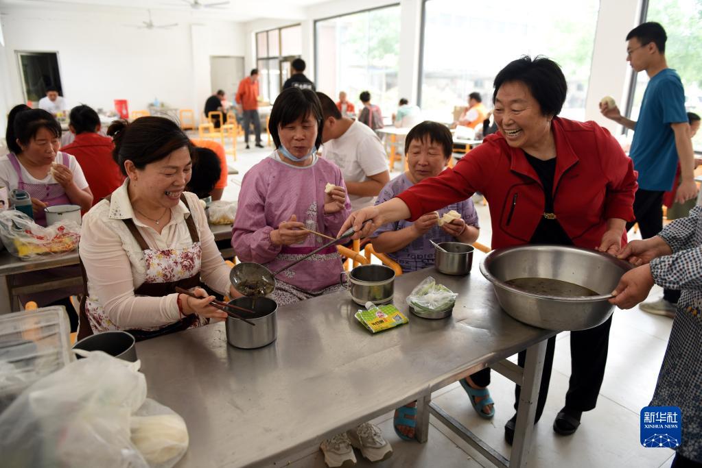 5月25日,在山東省日照市莒縣福利服裝廠職工食堂,廠長辛興芬(右二)在給工人加菜。