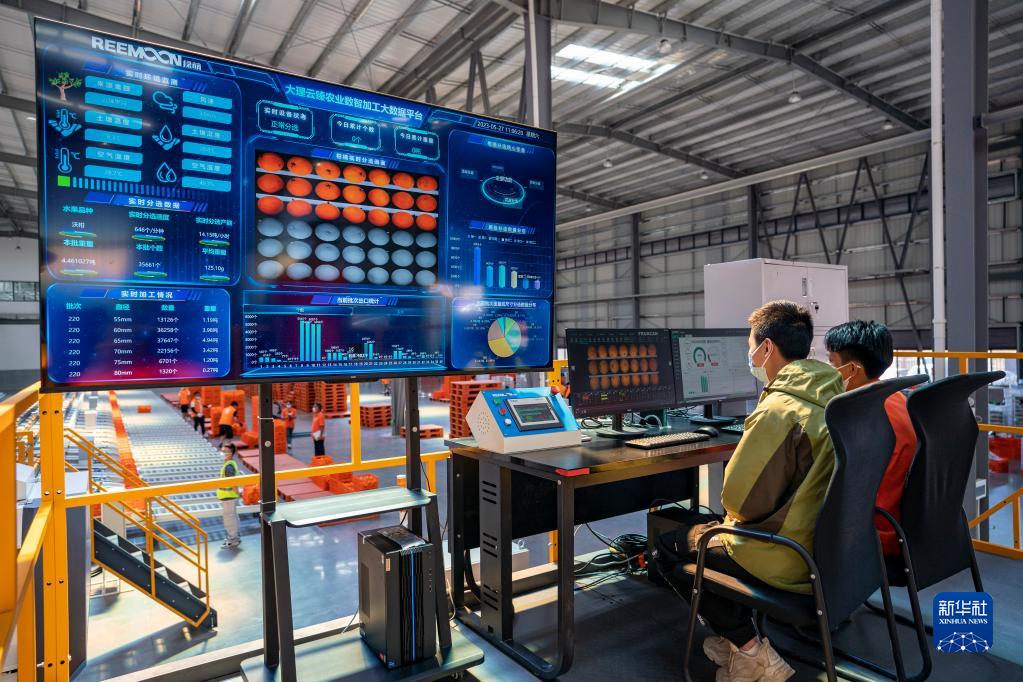 5月27日,工作人員在賓川縣一家農業企業水果分選流水線上監控柑桔分選。