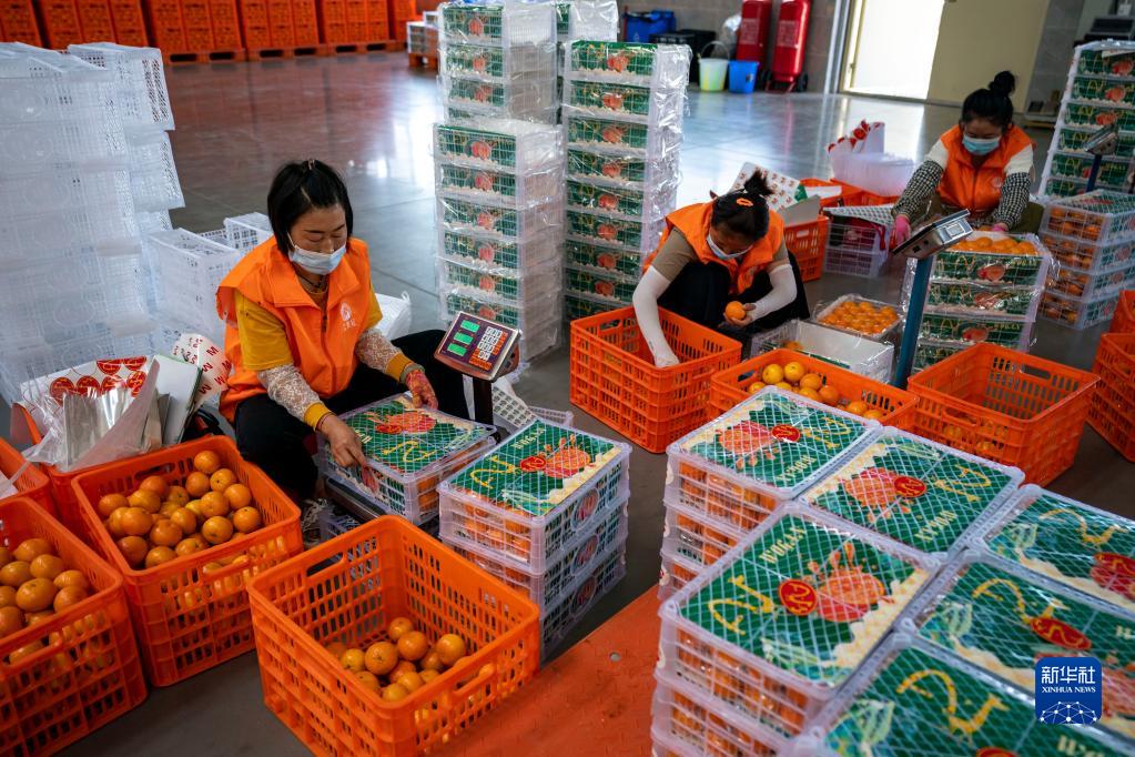 5月27日,工作人員在賓川縣一家農業企業內包裝柑桔。
