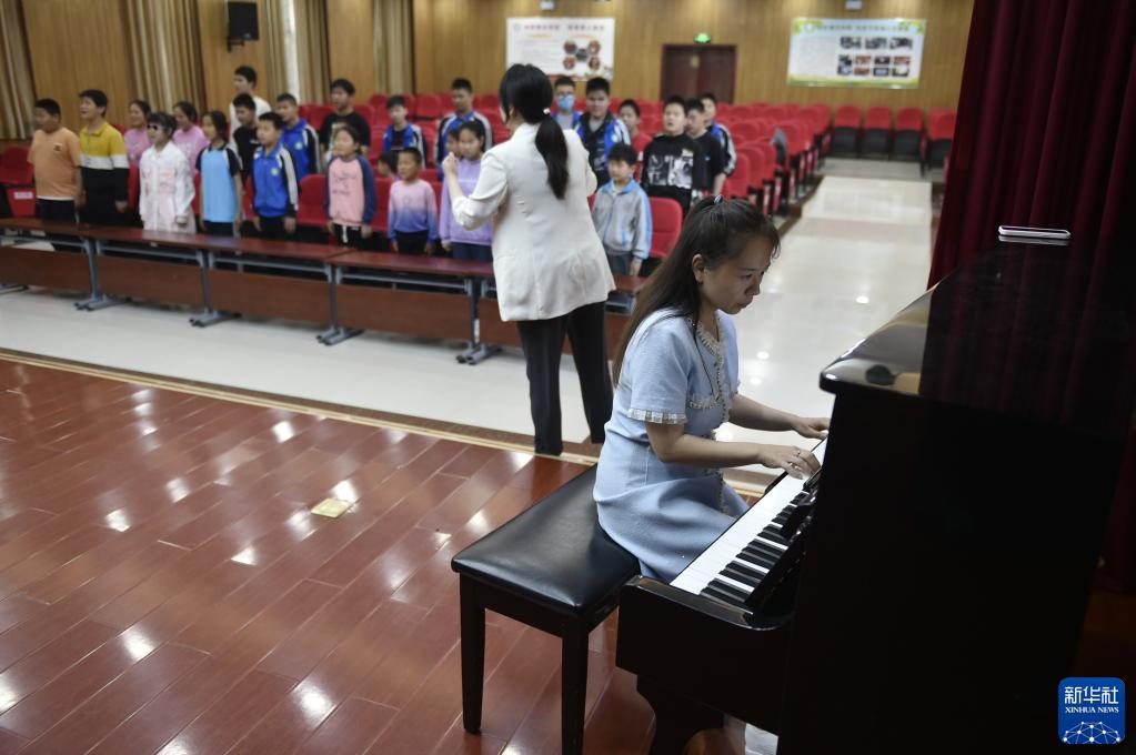 5月24日,在許昌市特殊教育學校,盲童合唱團的團員練習合唱,忽曉進行鋼琴伴奏。