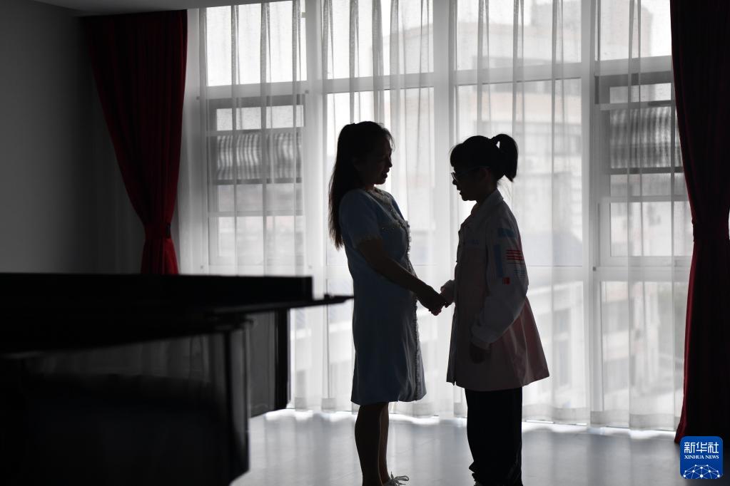 5月24日,在許昌市群眾藝術館,忽曉(左)與盲童合唱團的團員在練習鋼琴間隙交流。