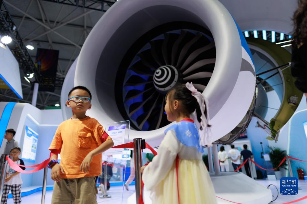 5月26日,兩名小朋友在“數博會”上參觀國產航空發動機。