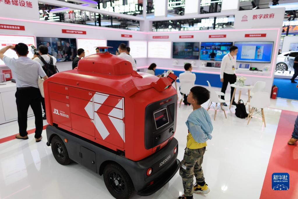 5月26日,一名小朋友在“數博會”上參觀物流智能快遞車。
