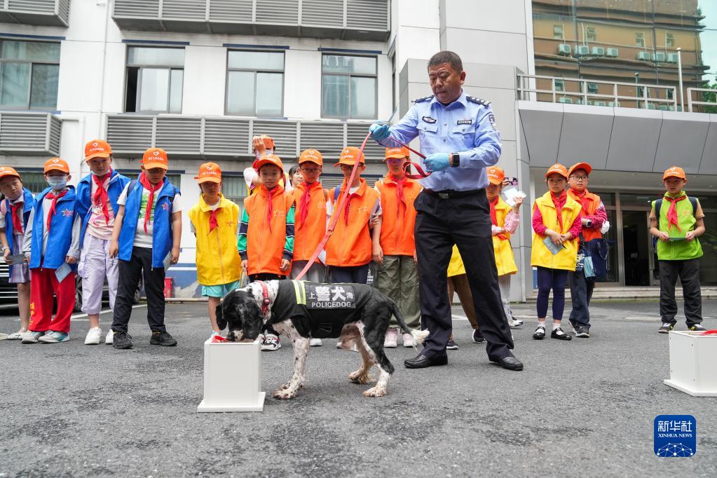5月27日,在上海市公安局徐匯分局湖南路派出所,民警在向孩子們展示警犬搜爆。