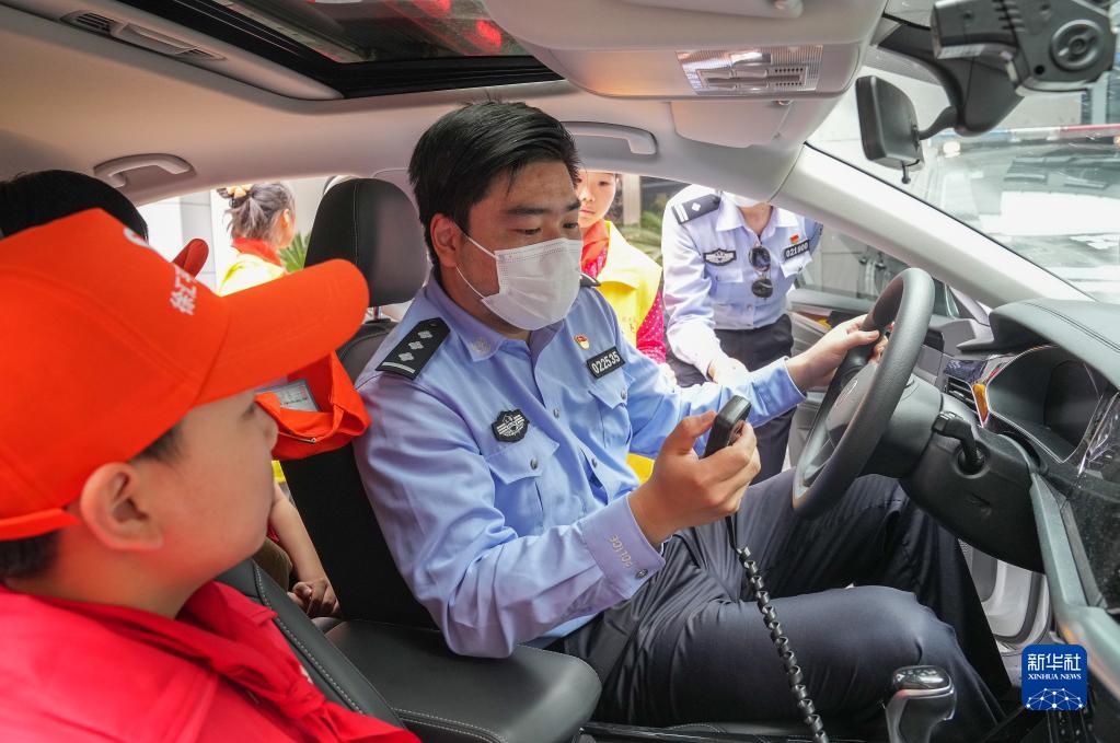 5月27日,在上海市公安局徐匯分局湖南路派出所,民警在向孩子們介紹警車中各種設備的用途。