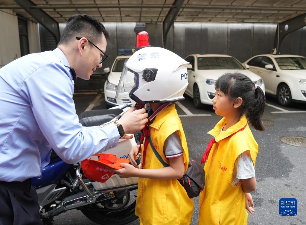 5月27日,在上海市公安局徐匯分局湖南路派出所,民警在幫助孩子們體驗警用頭盔。