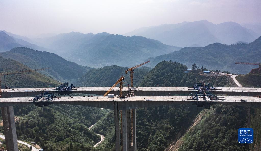 5月27日拍攝的貴金古高速清池特大橋主橋連續剛構合龍現場(無人機照片)。