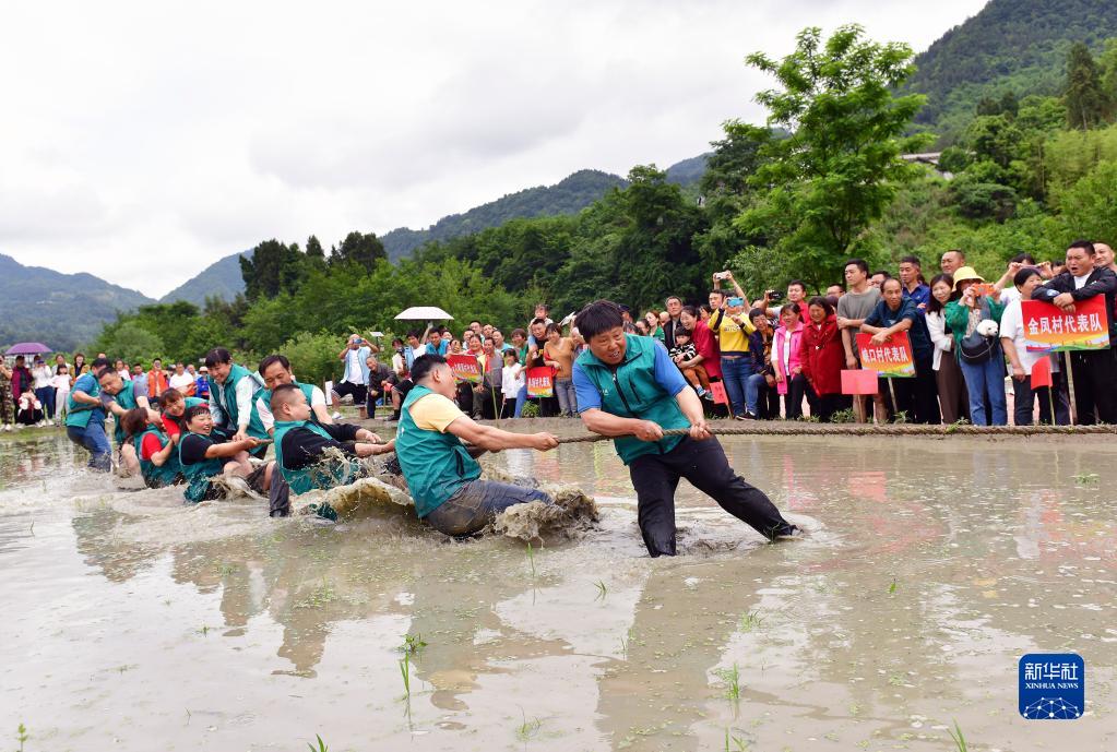 當日,湖北省宜昌市秭歸縣九畹溪鎮舉辦農民趣味運動會,來自各村的200多名農民進行拔河、挑水、插秧、摸魚等趣味競技比賽,樂享農耕文化的快樂。
