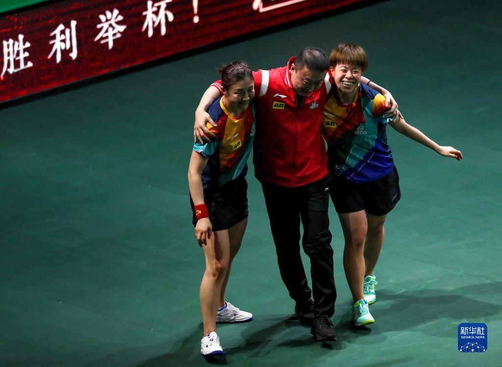 5月27日,陳夢(左)/王藝迪(右)與教練馬琳慶祝勝利。