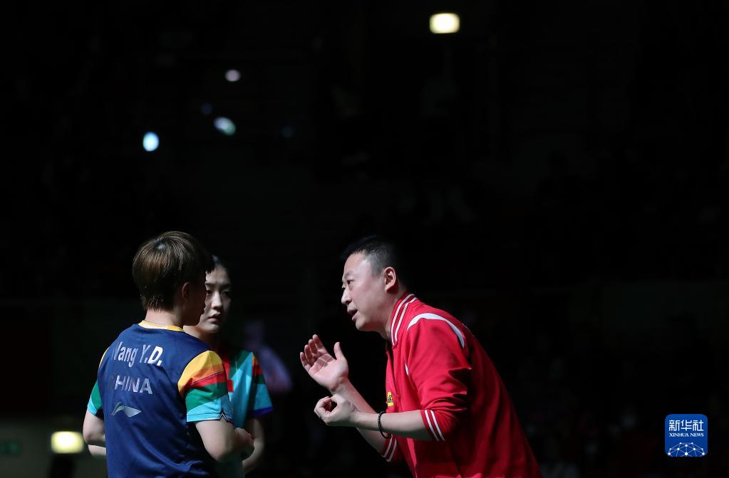 5月27日,教練馬琳(右)在比賽間隙指導陳夢(中)/王藝迪。