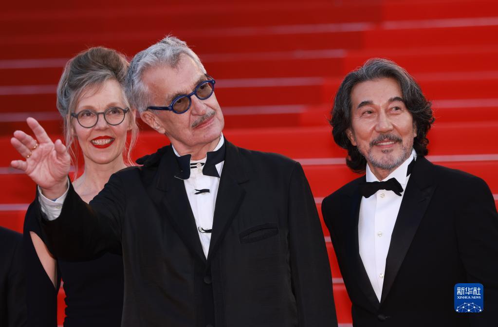 5月27日,在法國戛納國際電影節上,影片《完美的日子》的導演維姆·文德斯(中)和主演、日本演員役所廣司(右)踏上閉幕式紅毯。