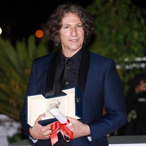 5月27日,在法國戛納,憑借影片《完美的日子》獲得電影節最佳男演員獎的日本演員役所廣司展示獎杯。