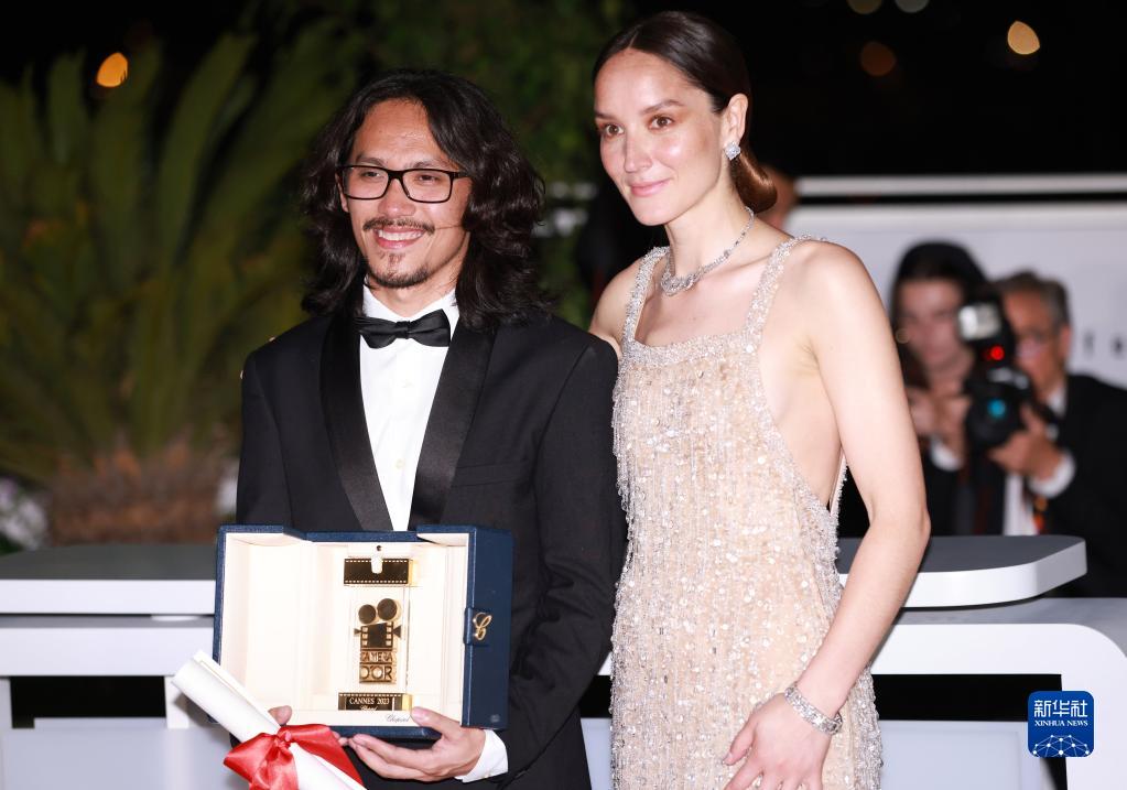 5月27日,在法國戛納,憑借《金色繭房》獲得電影節“金攝像機”獎的柬埔寨導演范天安(左)與“金攝像機”單元評委會主席阿奈絲·德穆斯捷合影。