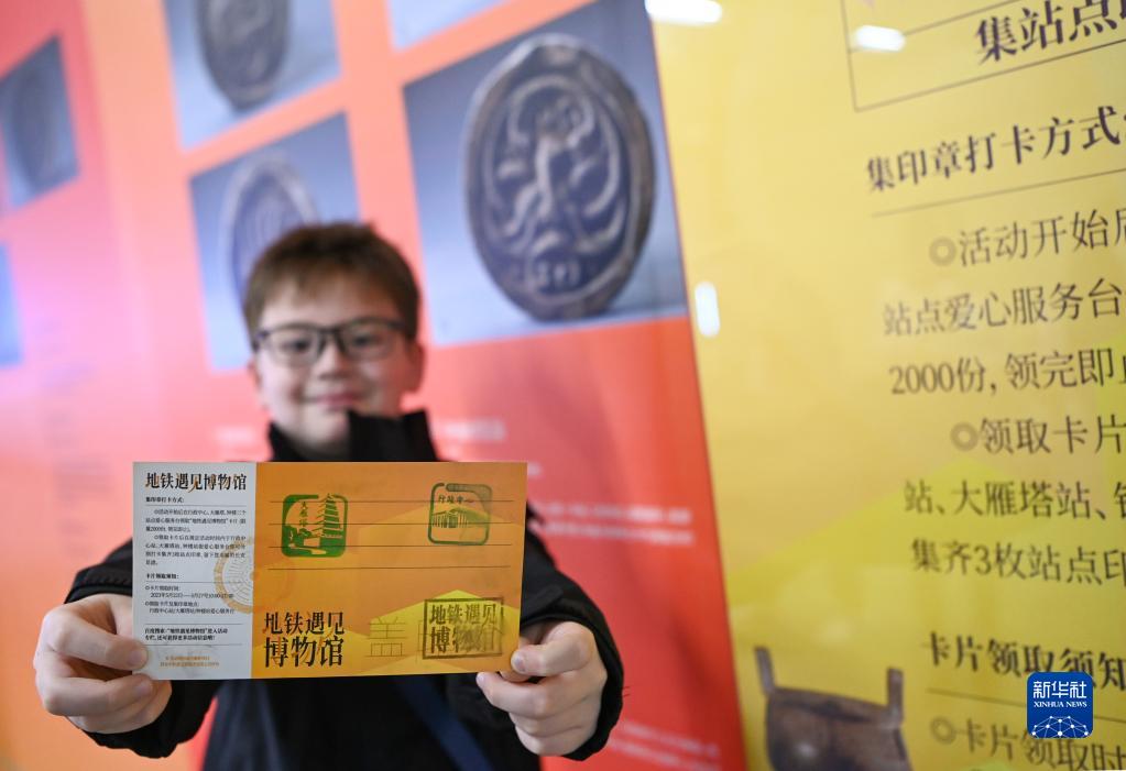 在西安地鐵大雁塔站,一名小游客展示收集的印章(5月27日攝)。