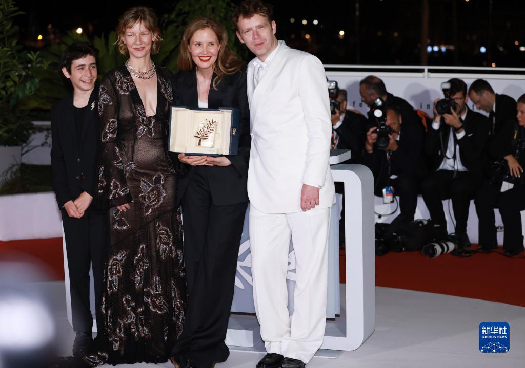 5月27日,在法國戛納,法國導演朱斯蒂娜·特里耶(右二)與主要演員展示“金棕櫚獎”獎杯。