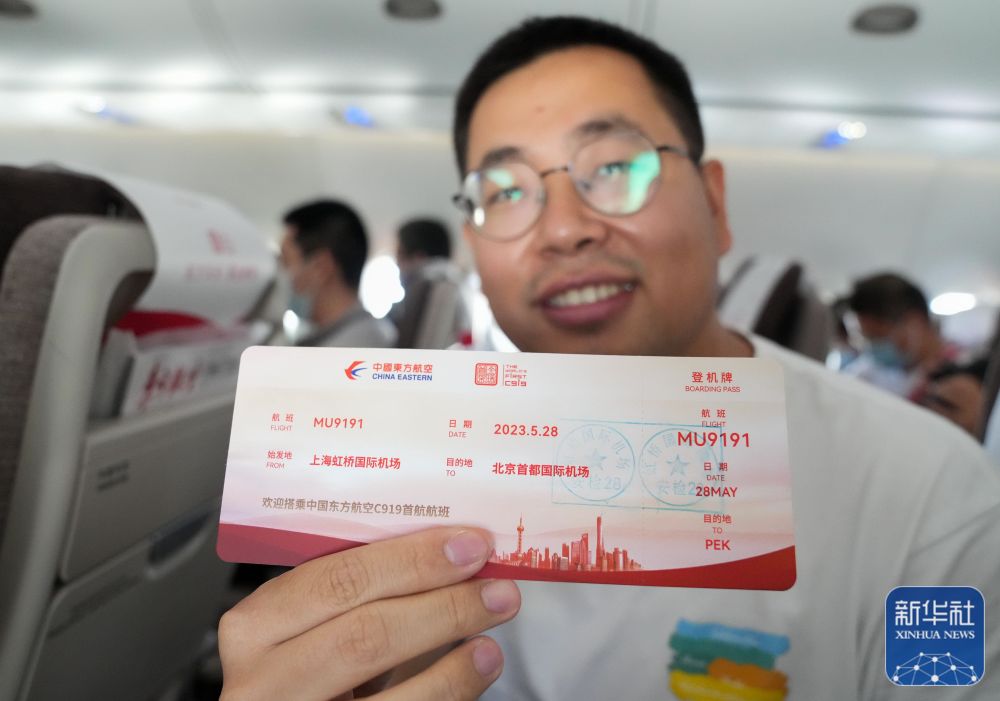 5月28日,旅客在飛機上展示C919首個商業航班東航MU9191的“紀念登機牌”。新華社記者丁汀攝