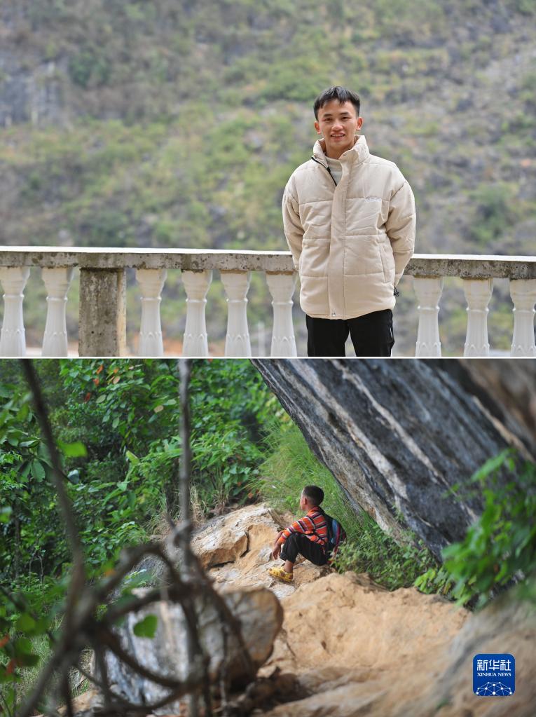 拼版照片:上圖為2023年1月16日,在大化瑤族自治縣板升鄉弄雷村,即將從技校畢業的蒙科佑站在家門口;下圖為2012年9月5日,在大化瑤族自治縣板升鄉弄雷村,10歲的蒙科佑在上學途中,坐在懸崖邊上休息。21歲的蒙科佑,希望能掙錢供弟弟妹妹讀書,讓他們接受更好的教育。