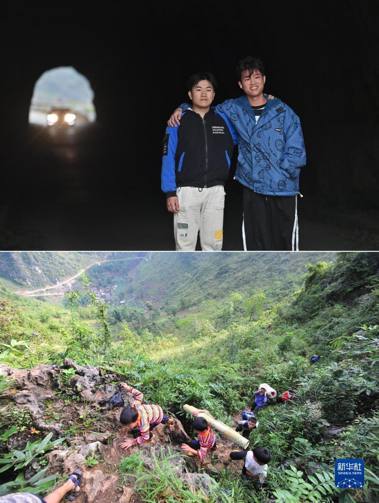 拼版照片:上圖為2023年1月20日,在大化瑤族自治縣板升鄉弄勇村,22歲的蒙宣任(左)和弟弟蒙宣汰站在通往弄勇小學的隧道旁合影,隧道上方是他們兒時上學需要攀爬的“天梯”;下圖為2012年9月3日,在大化瑤族自治縣板升鄉弄勇村,蒙宣汰(左一)、蒙宣任(左二)爬山路去學校。蒙宣任目前在遼寧省交通高等??茖W校讀書,弟弟蒙宣汰從技校畢業后在廣東一家汽修廠上班。