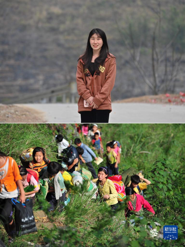 拼版照片:上圖為2023年1月21日,在大化瑤族自治縣板升鄉弄勇村,大專畢業后在廣州工作的藍秋艷回家過年時在家門口留影;下圖為2012年7月4日,學校放假后,11歲的藍秋艷(著黃衣者)背著生活用具,走在回家的山路上。22歲的藍秋艷正在努力考取教師資格證。