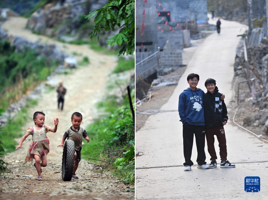拼版照片:左圖為2012年7月16日,在大化瑤族自治縣板升鄉弄勇村,4歲的蒙宣宏(左)穿著姐姐的舊衣服和同為4歲的藍小帥在一起玩耍;右圖為2023年1月21日,在大化瑤族自治縣板升鄉弄勇村,蒙宣宏(左)和藍小帥合影。蒙宣宏和藍小帥目前分別在板升鄉和大化縣城讀初二。