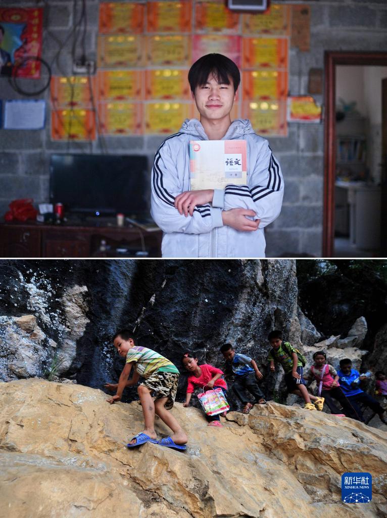 拼版照片:上圖為2023年1月26日,在大化瑤族自治縣板升鄉弄雷村,大化瑤族自治縣高級中學高二學生蒙文超站在家里,身后的墻上貼滿獎狀;下圖為2012年9月5日,在大化瑤族自治縣板升鄉弄雷村,7歲的蒙文超(左一)放學后爬懸崖回家。今年18歲的蒙文超最大的夢想是一年后考上理想的大學。