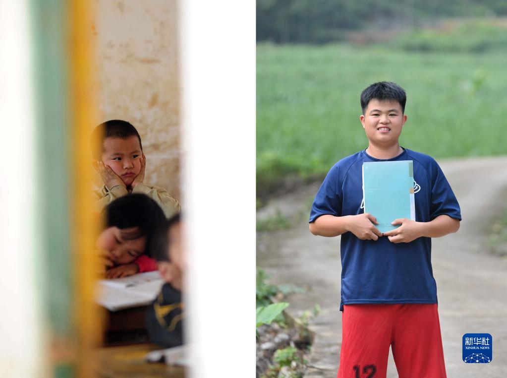拼版照片:左圖為2012年3月27日,在大化瑤族自治縣大化鎮仁良小學,6歲的韋康濤在教室里上課(新華社記者黃孝邦攝);右圖為在大化瑤族自治縣高級中學讀高二的韋康濤(新華社記者胡星宇 2023年5月21日攝)。韋康濤的夢想是考上理想的大學。