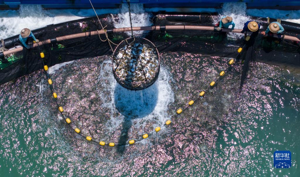 5月27日,在湛江徐聞西連鎮,漁業工人從深海網箱中打撈金鯧魚(無人機照片)。