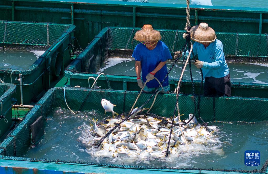 5月27日,在湛江市徐聞縣西連鎮,漁業工人將從深海網箱中打撈出的金鯧魚放入運輸船(無人機照片)。