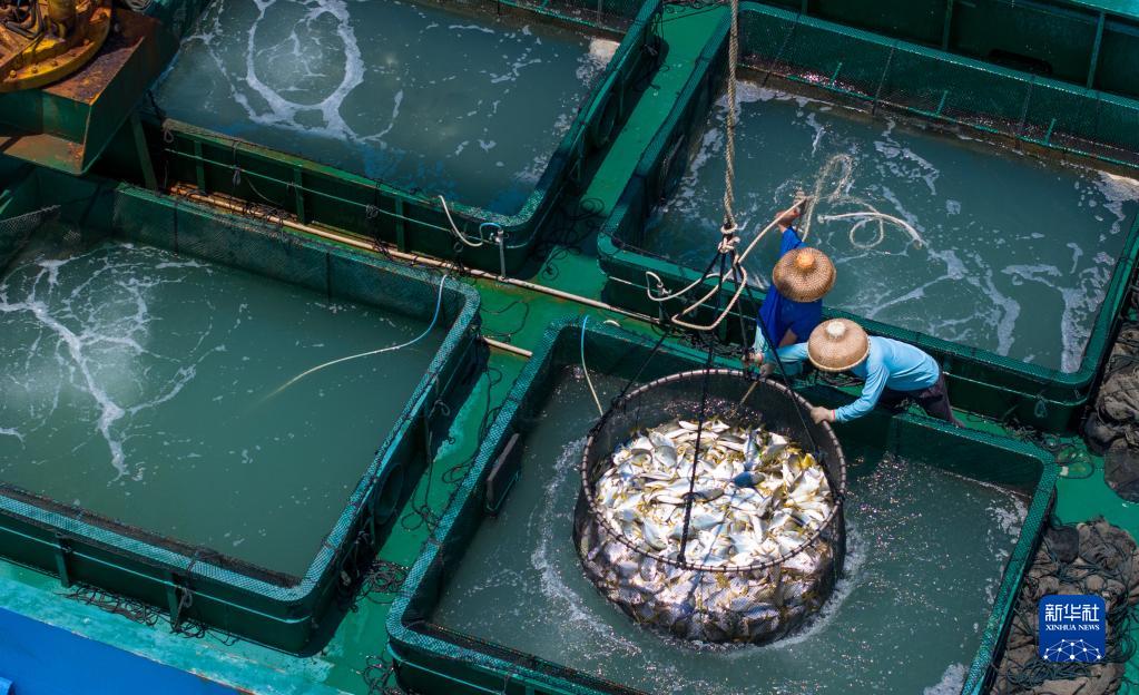 5月27日,在湛江市徐聞縣西連鎮,漁業工人將從深海網箱中打撈出的金鯧魚放入運輸船(無人機照片)。