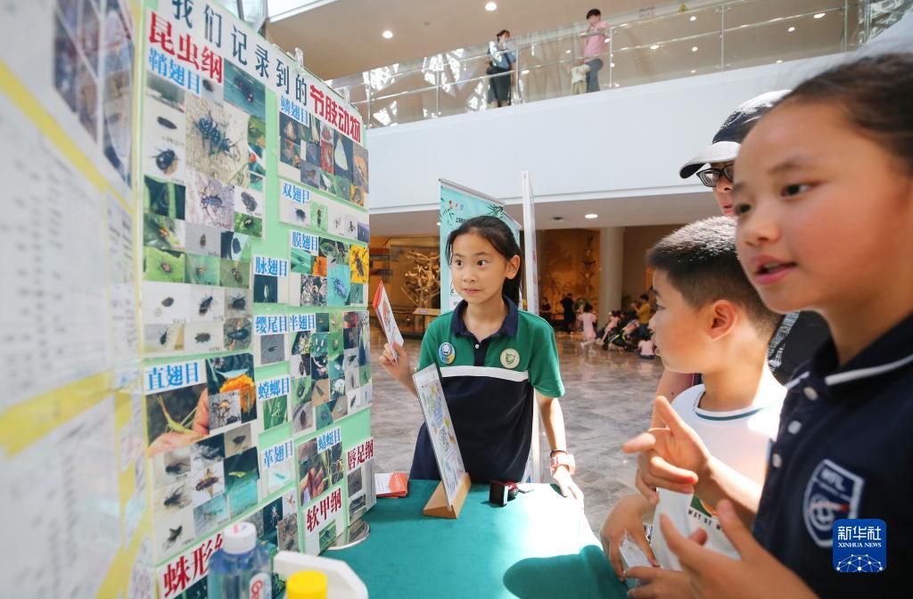5月28日,幾名小朋友在一個關于居民小區昆蟲種類調查的展板前交流討論。