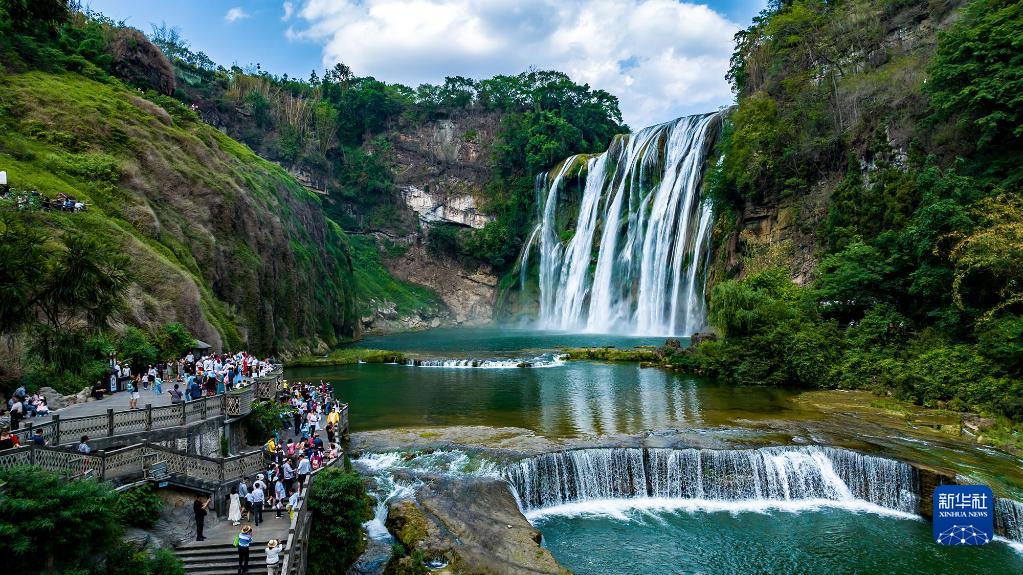 5月27日,游客在位于貴州省安順市的黃果樹瀑布景區游覽(無人機照片)。
